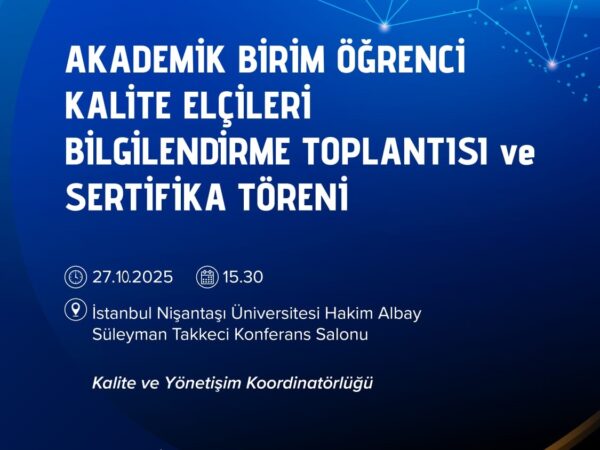 İstanbul Nişantaşı Üniversitesi Kalite ve Yönetişim Koordinatörlüğü, üniversitemizin vizyonu ve misyonu doğrultusunda kalite yönetimi ilkelerini benimseyen ve uygulayan bir birimdir. Üniversitemizin sürekli gelişim ve mükemmeliyet anlayışını desteklemek amacıyla kurulan bu koordinatörlük, eğitim, yönetim, araştırma ve hizmet alanlarında kalite standartlarını güvence altına almak için çaba göstermektedir.